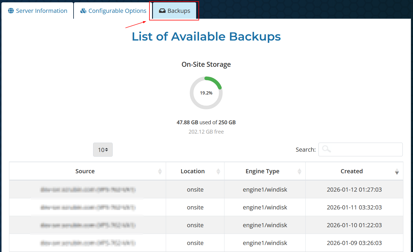 This will default to the Server Information. Select the Backups tab, and you’ll be able to see a list of your current backups, as well as the total amount of space your backups consume.