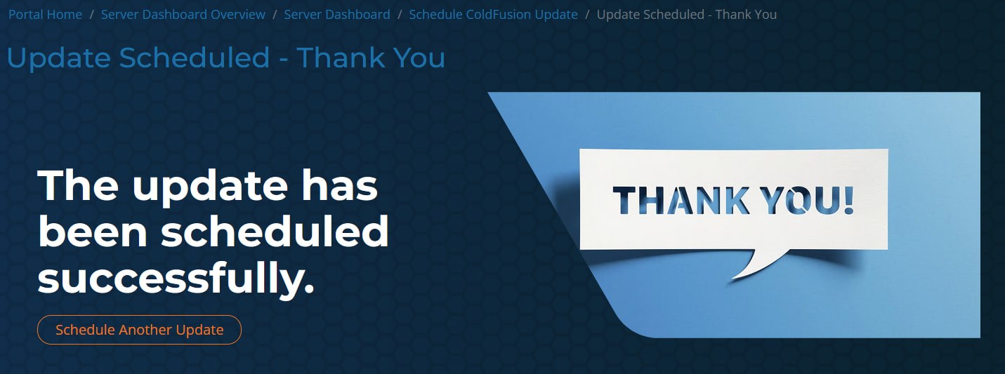 That’s it! You’ve successfully scheduled one of your server’s ColdFusion services to be updated to the latest version. If you have other servers you want to update, click “Schedule Another Update” on the thank-you page, as shown in the screenshot below.