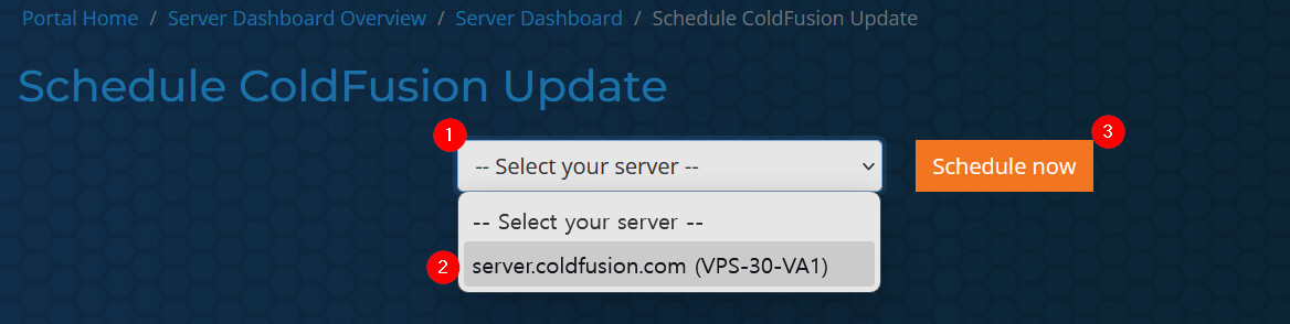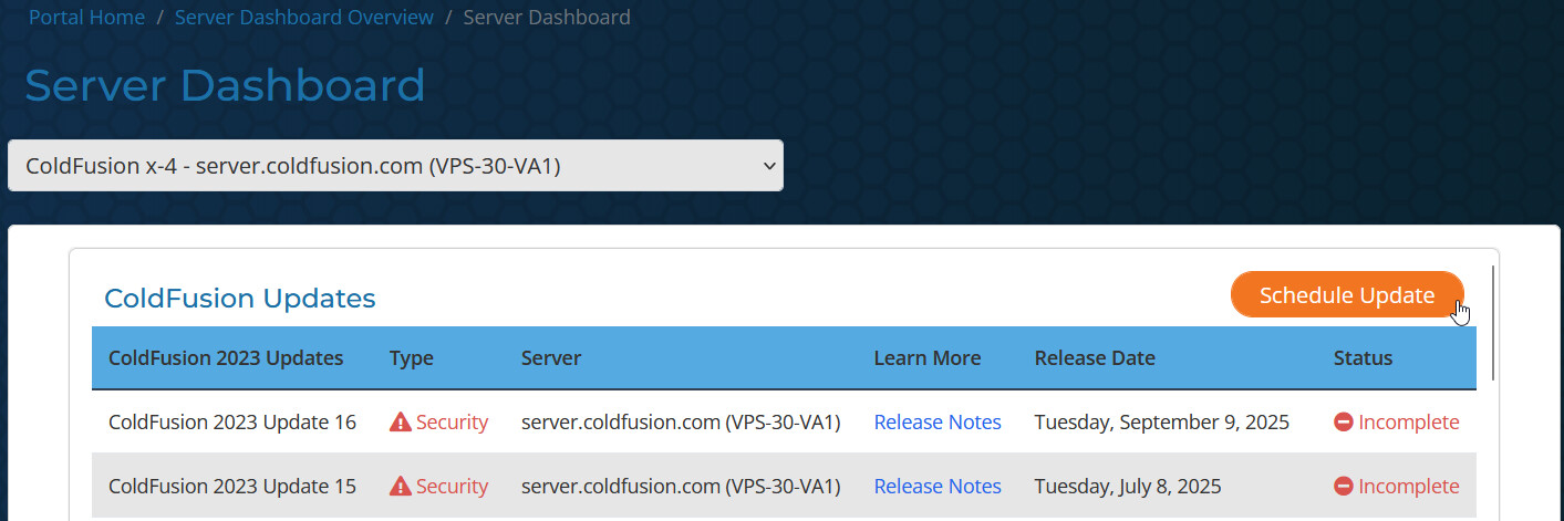 This article will serve as a guide for scheduling ColdFusion Updates on your dashboard-enabled servers.