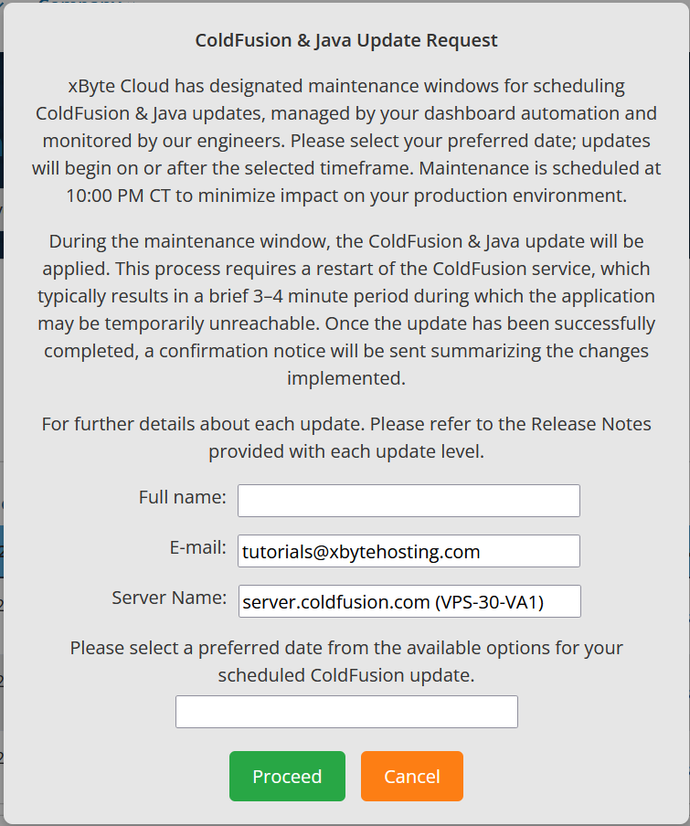 A form will appear asking you to input your full name and to select a date for the update. All updates are performed at 10:00 PM CT via your dashboard automation. Once you’ve filled out the form, select the “Proceed” button to submit your request.