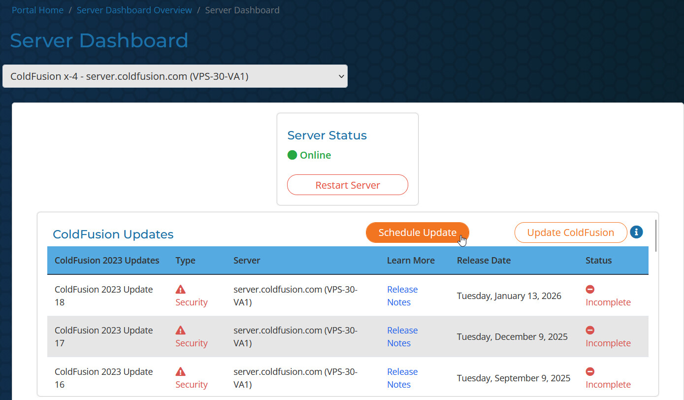 That’s it! You’ve successfully scheduled one of your server’s ColdFusion services to be updated to the latest version. If you have other servers you want to update, navigate to the dashboard for that server and click the “Schedule Update” button.